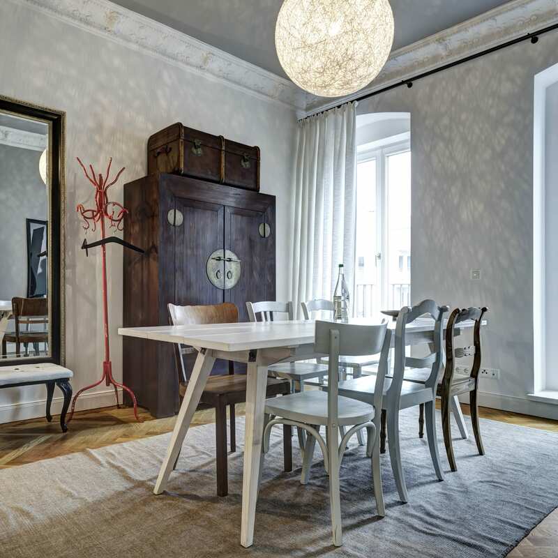 Gorki 아파트가 텅 비어있는 침실 1개짜리 스위트라 하더라도 여전히 경탄을 자아낼 것입니다. 아름다운 비율과 프렌치 도어, 화려한 크라운 몰딩이 20년대 전성기 베를린을 떠올리게 합니다. 다채로운 앤티크 가구와 어울리지 않는 듯한 의자, 그리고 사파이어 블루의 지하도 타일을 사용한 실내 욕조가 더욱 진한 멋을 더해줍니다. 아담한 발코니에서는 노천카페에 앉아 있거나 나무가 줄지어 서 있는 가로수길을 오르내리는 사람들이 내려다보입니다.